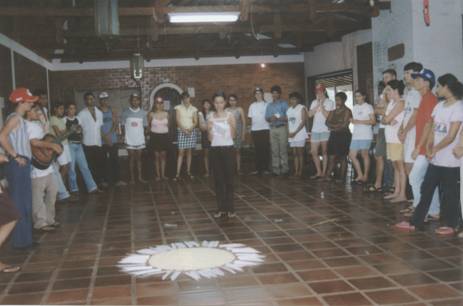 Momento de uma celebração da mística No período de formação dos educadores do MST no PRONERA, a celebração da mística foi uma constância, na medida em que programavam as atividades referentes à formação dos educadores. Ao selecionar os conteúdos a serem trabalhados, o grupo já começava a delinear as atividades da mística, buscando a sua articulação dentro da proposta de trabalhos com os conteúdos e práticas educacionais formadoras. Relatamos, a seguir uma das atividades da mística, preparada pelo grupo de educadores, realizada em outubro de mil novecentos e noventa e nove que, após discussão coletiva, elaboraram o roteiro, cuja temática foi COMPROMISSO COLETIVO. Iniciaram a atividade, como sempre, cantando as suas músicas. Produziram o texto abaixo, que cada qual foi fazendo a sua leitura solene, para socializar a produção própria. A MILITÂNCIA é: Vivenciar os momentos místicos é estar vivendo, construindo e conservando as raízes do povo intercalando com a mística. Nós educadores e militantes do MST não podemos perder de vista o nosso horizonte. A luta é constante, é omnilateral. Ao mesmo tempo que temos que trabalhar, temos que estudar, pesquisar, cantar... Temos que desenvolver e construir aspectos ligados ao comportamento na relação humana. A educação no MST não poder fugir da realidade do nosso povo, há momentos tristes e alegres. Em todo processo organizativo existem e permanecem raízes místicas dos trabalhadores sem terra na luta. O ser humano é o centro e o maior símbolo da nossa organização. Tudo isso que existe no MST é mística. Como trabalhar os símbolos e a mística com os grupos de estudo? Levantar o significado dos símbolos, resgatar valores. A mística nós vivemos ela todos os dias, nós imitamos o que nossos pais faziam para trabalhar. A mística é a imitação, a encenação, o ritual que temos em nosso trabalho. Nós, como monitores temos que passar aos alfabetizandos a idéia de mística. As crianças que vivem nos acampamentos brincam de desocupação e saem atirando nos seus companheirinhos. Isso é a mística. Como vivenciar a mística em processo (cursos, comunidade, indivíduo...)? Como está no nosso espírito místico, a educação no MST? A mística não tem uma explicação. Cada um pode fazer uma relação com os momentos místicos da Igreja. O pão e o vinho e o padre com vestes místicas. A ornamentação da igreja e o roteiro estão voltados para um objetivo que é pregar. O MST também tem a sua mística. O padre vive a mística em todos os seus momentos, em um ambiente especial com encenações preparadas com símbolos significativos. O momento da mística serve para passar conhecimentos, lembrar pessoas, para incentivar a educação, para renovação da criatividade, ela é a força que anima o militante. Através da mística se vive o reforço ideológico. Devemos arrepiar os cabelos dos braços. Quando ela é vivida e as pessoas não sentem emoção não teve valor. Ela deve mexer com nossos anseios, com nossos sentimentos. A vida em coletivo durante tantos dias deve ser a nossa mística nesse encontro. O carisma e força ideológica devem estar presentes todos os dias em nossas ações individuais e coletivas aqui e nos grupos de alfabetização. Como encaminhamos a mística nos grupos de estudo? Nós valorizamos o saber do povo. Nós resgatamos os valores da mulher? Como nós podemos criar o lado místico da vida das mulheres no movimento? No caso de uma desocupação, um policial apontava arma para uma criança e ela passou o dedo no cano do rifle e disse: “que cano grosso”, esse é um momento místico. O que a gente faz é com sentimento, o tocar violão para o grupo tem significado. Compor uma música é viver a mística. Como é que nós sentimos os nossos cantos, nossas palmas? O que nós sentimos quando cantamos? Ela joga a gente para cima, nos deixa tranqüilo. A música faz parte da mística, ela faz parte da vida das pessoas. Ela denuncia momentos alegres e tristes. Ela nos faz reviver a história do MST. A reflexão sobre a música é um ato de importância na mística. A conscientização, a animação e a indignação são funções da música. A marcha ocorreu como símbolo de força que faz as pessoas caminharem. Nós gravamos a imagem das pessoas que morreram na luta pelo objetivo da transformação e eles se transformam em nossos símbolos assim como a bandeira, o hino, a música. A bandeira tem nas suas cores várias místicas: vermelho - sangue derramado; verde - é terra, são os campos plantados, é a esperança, as idéias de reconstrução da natureza; preto - é luto; branco é paz (distribuição de terra); o casal de trabalhadores (homem e a mulher), companheiros de luta, estão construindo juntos o MST. O homem e a mulher fazem parte da natureza a ser transformada. Por quê o facão? É a prontidão para o trabalho. Trabalho de derrubada da cana, da seringueira. O facão vai além do mapa do Brasil. Mostra que a luta é do povo trabalhador em outras nações. É a luta dos excluídos para a construção de uma sociedade diferente. O mapa para identificar a luta no território brasileiro. A bandeira retrata a luta da classe trabalhadora no Brasil. Ela significa o apontamento da saída, é a visão de um horizonte que possibilita a transformação. Como alfabetizador, devemos respeitar a bandeira do MST. O peso da bandeira é o peso da conscientização que temos da realidade social brasileira. Hino. O hino pode ser trabalhado com o significado das palavras, o ritmo da música, no texto da letra (a composição das estrofes). O uso do braço esquerdo é para mostrar que o MST é da esquerda, é a realidade de não aceitação da sociedade que está aí, é o se colocar em situação diferenciada, de lutador contra o sistema da burguesia se organizar socialmente. O ser humano é o maior símbolo de todo o trabalho do MST. A letra mostra nossa força, nossa garra, noss