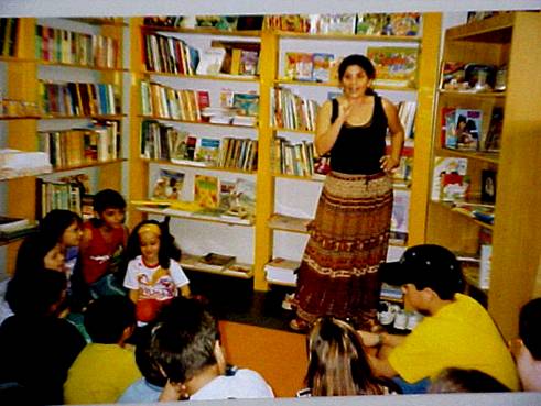 A livraria fica entre duas escolas; uma, particular, atende desde alunos da educação infantil até os do ensino médio; a outra, estadual, atende alunos do ensino fundamental – ciclo I – de primeira à quarta séries. Muitos alunos e professores destas duas escolas são assíduos freqüentadores da “Hora do Conto”. O encontro acontece às sextas feiras no final da tarde. Uma música anuncia que é chegada a hora do conto e as crianças tomam seus lugares sobre a colcha e cantam. Ao final da melodia, um grande silêncio e a história é contada. Este momento é de importância vital, pois representa uma passagem de um mundo para outro:do real para o imaginário das histórias (MACHADO, 2004). A contadora de histórias veste-se com saias indianas e alguns véus são utilizados durante o conto. Estes servem para representar vários elementos do texto apresentado, entretanto possibilitam que cada ouvinte visualize, pela própria criatividade e imaginação, estes elementos, pois um véu pode representar um carro, apesar de não ser nem um pouco parecido com ele. Desta forma aquele que ouve a história, apesar de visualizar o véu que representa um elemento, imagina este elemento conforme lhe convém, conforme suas próprias referências e de acordo com seu próprio processo criativo. Assim, a história deve ser contada com riqueza de detalhes para que aquele que a ouve tenha as informações necessárias para produzir, em seu imaginário, o cenário, as personagens e as situações que acontecem durante a narrativa. Ainda sobre a utilização de objetos durante o conto, neste caso os véus, devemos salientar que sua fundamentação baseia-se em uma percepção flexível (MACHADO, 2004, p.88), ou seja, é possível visualizar algo atribuindo-lhe uma função que não é única, mas sim possui várias possibilidades funcionais de acordo com o indivíduo que as atribui. Larrosa propõe a leitura com os outros como pluralidade, como multiplicação e é neste sentido que se pretende atrelar a narrativa oral e a construção do imaginário de cada um, respeitando sua própria experiência, seu conhecimento, possibilitando inúmeras representações do texto, de acordo com a criatividade subjetiva.