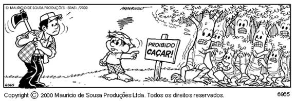 Na primeira tira, o emprego de recursos próprios das histórias em quadrinhos, que constituem sua construção composicional, constroem o que Bakhtin (2000) denomina “conteúdo temático”. Assim, a caracterização de Chico Bento, suas roupas, seu chapéu de palha, seus pés descalços e sua fisionomia de indignação, remetem à idéia de que o morador do campo preserva a natureza, ao contrário do homem da cidade, preocupado em extrair madeira para transformá-la em produtos e obter lucros. O machado, as roupas e o boné representam o homem em contato com uma sociedade de consumo. Portanto, a expressão do madeireiro é de espanto diante da raiva de Chico Bento, da placa “proibido caçar” e das expressões amedrontadas das árvores. Essa imagem constrói um efeito de sentido de que as árvores são “vivas”, de forma inversa à idéia de que elas são matérias inertes e mortas.