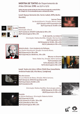 A Mostra do Departamento de Artes Cênicas da UNICAMP é composta de espetáculos criados pelos alunos do curso de Artes Cênicas, sob direção e orientação de professores e artistas convidados. As apresentações acontecem até 12/12, no Espaço Cultural Semente e no TAO (Teatro Arte e Ofício). A entrada para todas as apresentações é franca, com distribuição de senhas uma hora antes, no local.